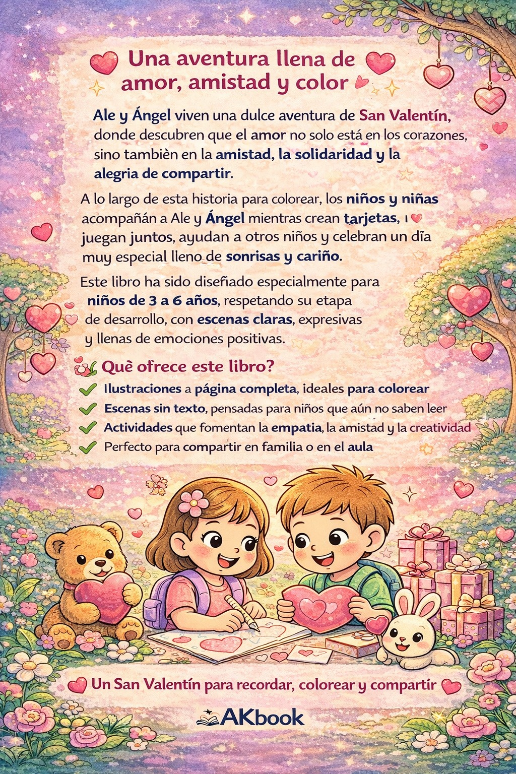 A lo largo de esta historia para colorear, los niños y niñas vivirán momentos especiales junto a los protagonistas. Crear tarjetas, jugar con amigos, ayudar a otros niños y celebrar un día lleno de sonrisas, abrazos y cariño.